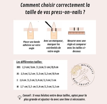 Grâce à une règle , mesurez l'écart des deux traits puis notez les mesures pour chaque ongle afin de les comparer avec notre guide des tailles disponible sur la droite. Dès que vous avez connaissance de votre taille parfaite, choisissez-le dans le menu déroulant.
